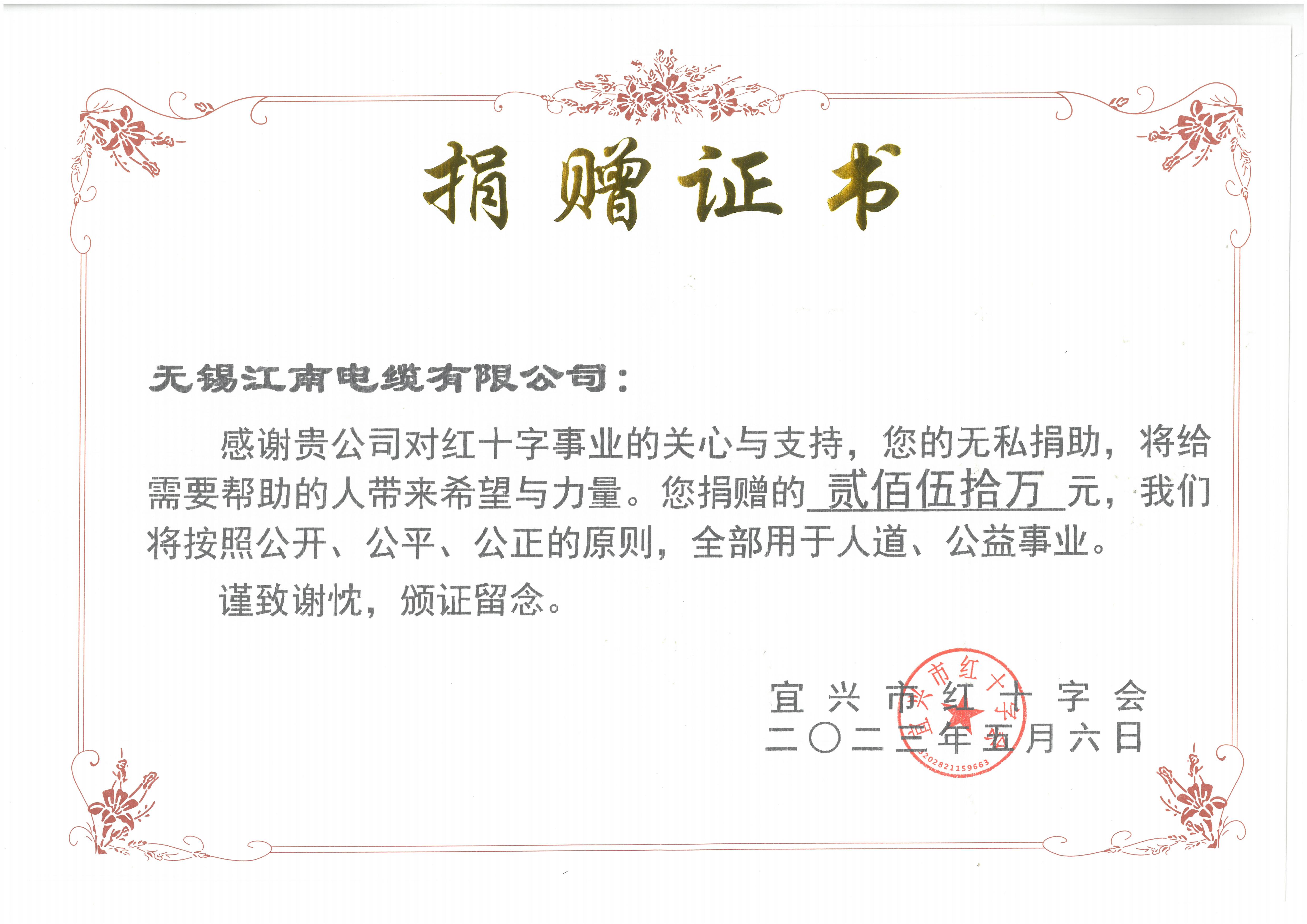 • 向宜兴市红十字会捐赠250万元--支持公益事业