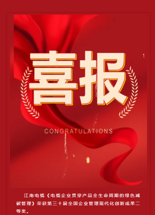 江南电缆《电缆企业贯穿产品全生命周期的绿色减碳管理》荣获第三十届全国企业管理现代化创新成果二等奖。“全国企业管理现代化创新成果奖”是国务院批准、中国企业家协会组织、国资委、工信部指导的中国企业管理领域… -