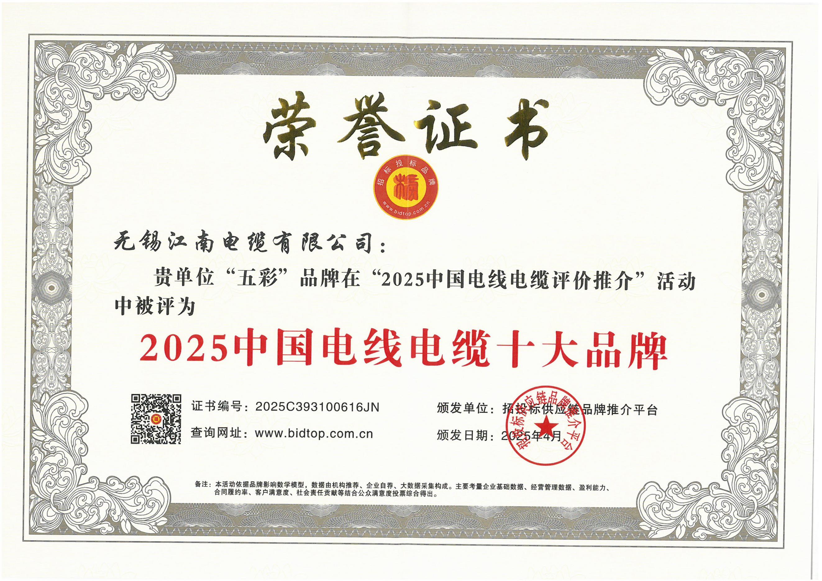 近日,由招投标供应链品牌推介平台举办的“2025中国电线电缆评价推介”活动圆满结束,江南电缆荣获2025中国“电线电缆十大品牌”、“电线电缆十大领军品牌”“电线电缆招标采购十大推荐品牌”等荣誉。