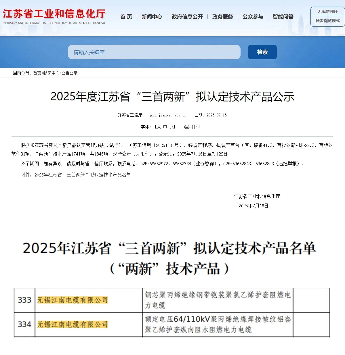 近日,江苏省工信厅公示2025年度江苏省“三首两新”拟认定技术产品名单,无锡江南电缆有限公司“铜芯聚丙烯绝缘钢带铠装聚氯乙烯护套阻燃电力电缆”和“额定电压64/110kV聚丙烯绝缘焊接皱纹铝套聚乙烯护套纵向阻水阻燃电力电缆”被认定为“两新”技术产品。