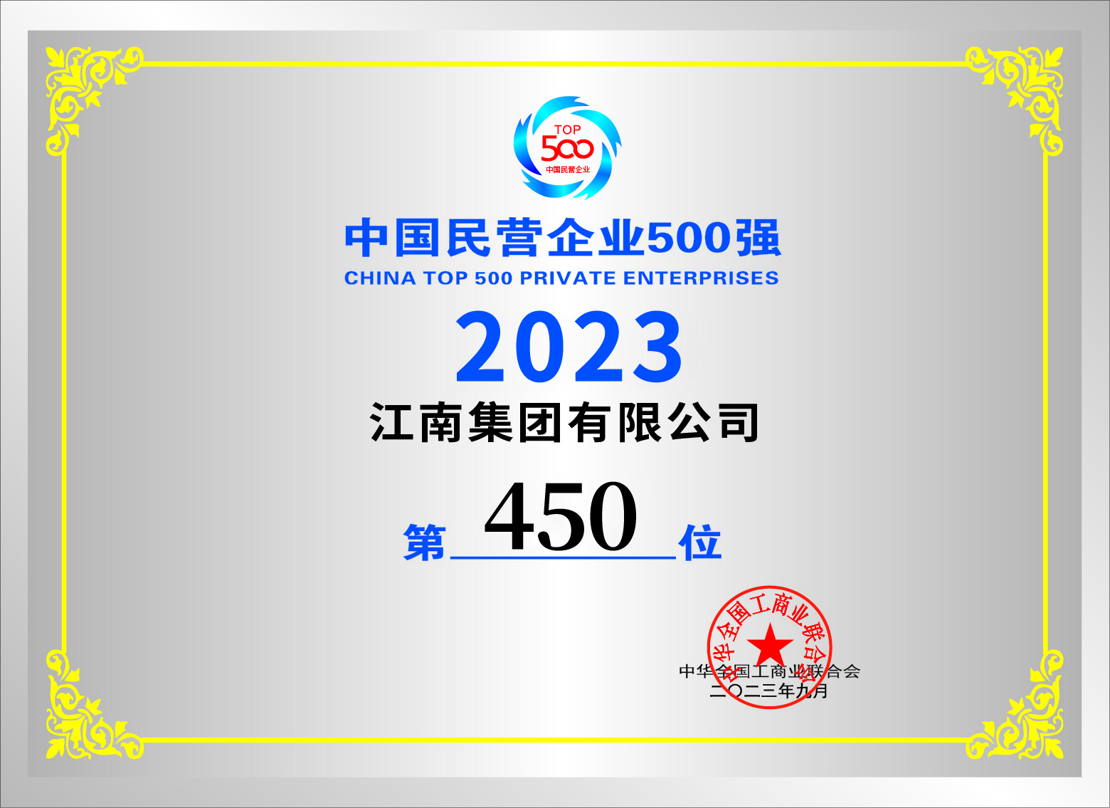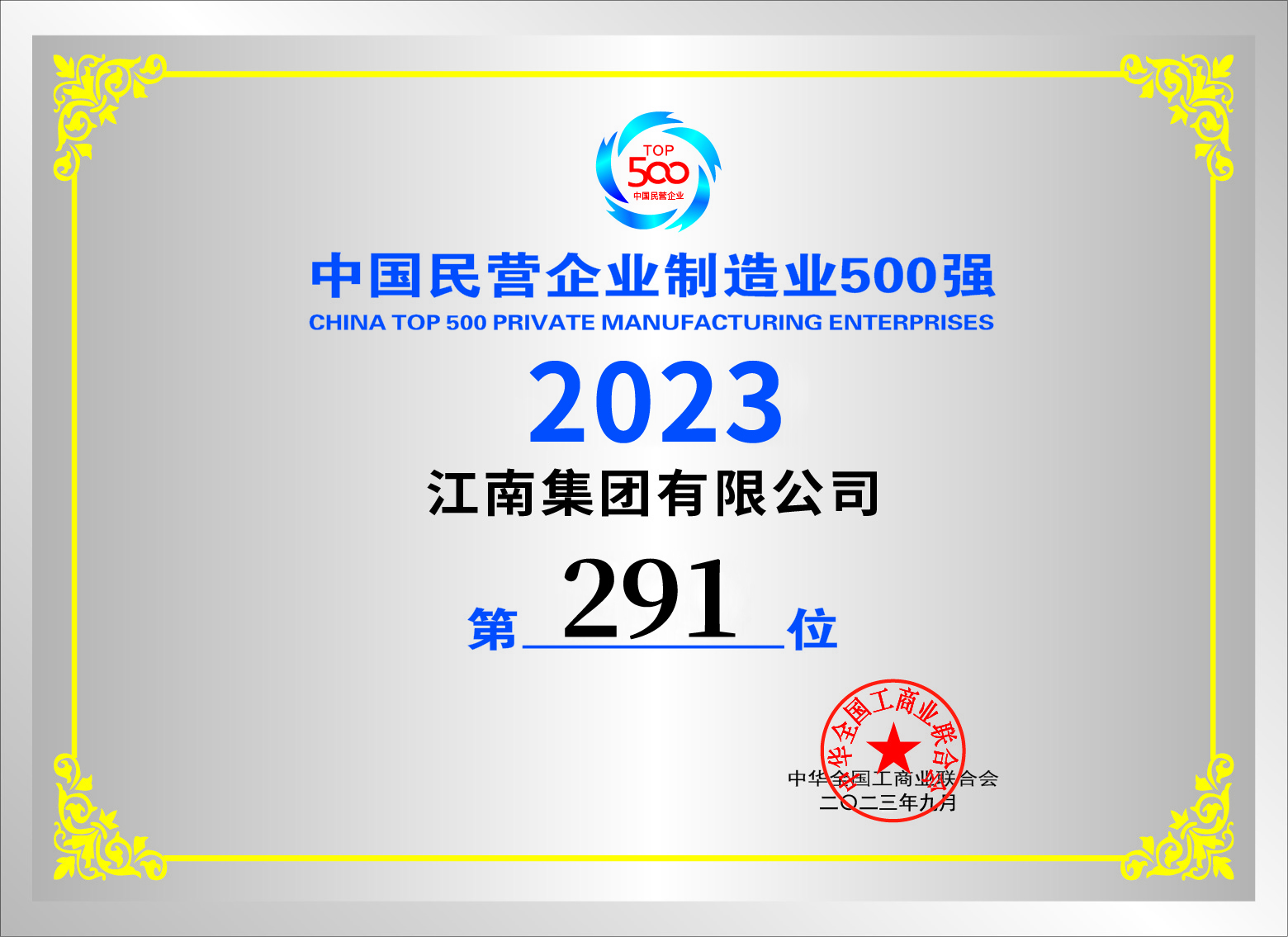 912日,2023中国民营企业500强峰会在济南召开。江南集团凭借雄厚的综合实力,蝉联2023中国民营企业500强和中国制造业民营企业500强双榜单!